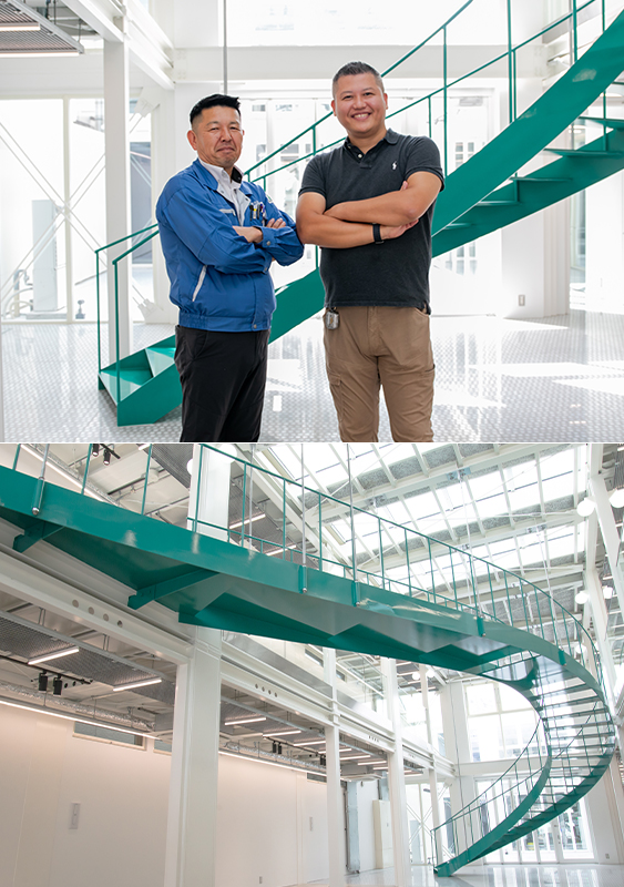 建物には25基のコンテナを積み、間を接続部材で連結するというユニークな躯体構成を採用しています。採用した経緯は私がたまたま東京で見たコンテナ構造に惚れ込んだことと、コンテナ自体の可搬性・拡張性・モジュール性を評価したことです。このように建物自体が是永商会の「技術の見本市」となるように、こだわりや技術、工夫を徹底的に詰め込んでいます。その中でもうねり加工を施した階段の製造と設置は是永商会と北田工務店技術と工夫の総力戦でした。私たちが得意とする高精度な鉄骨加工を駆使して上昇勾配と曲げ加工といった複合要素を込めた階段を、上部からの吊りと3点支持を採用したことで安全性を担保しつつも他にはないものを生み出すことができました。本当に難しい特殊なデザインでも、しっかり実現できたのは北田工務店の力を掛け合わせることができたおかげですね。
